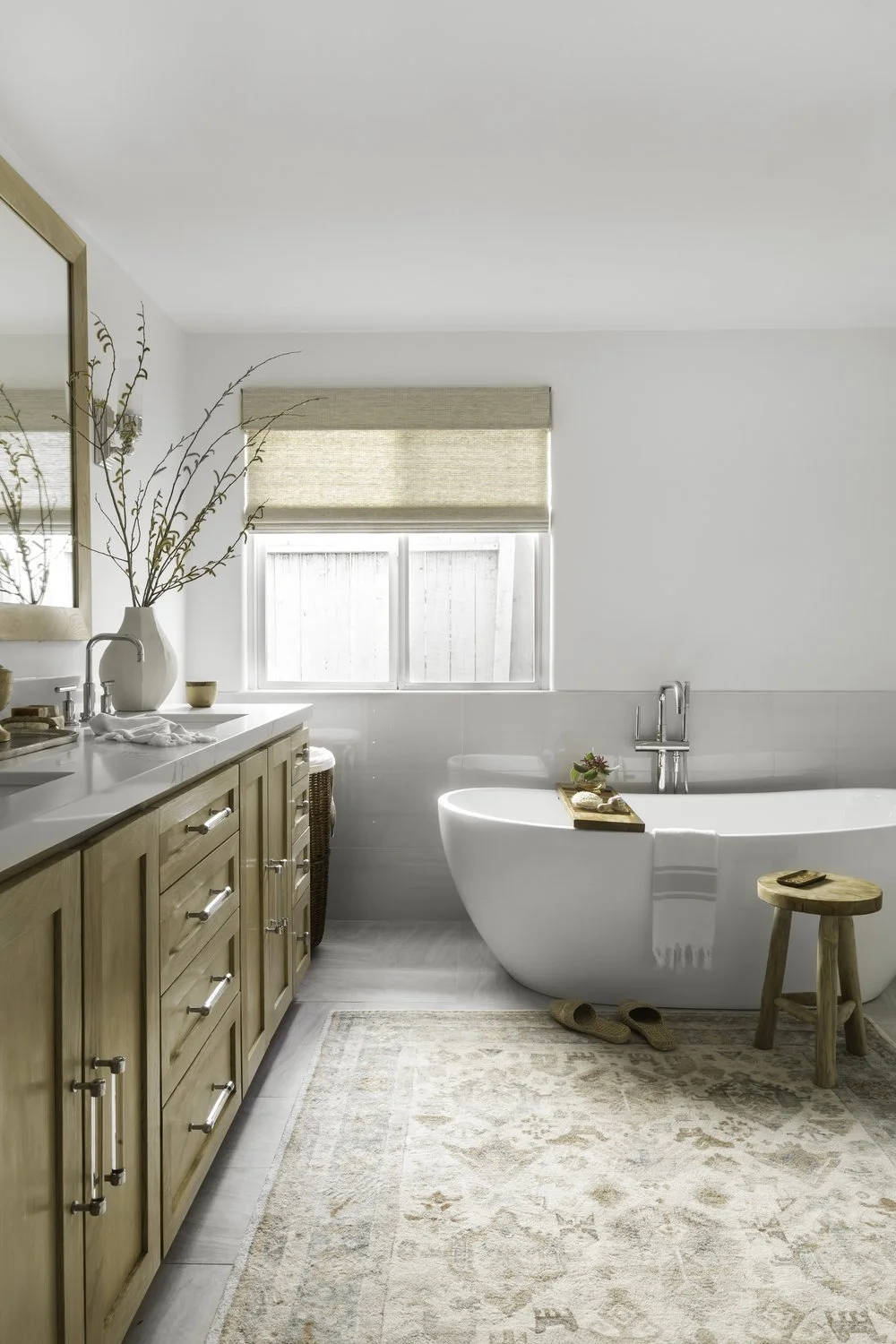 Looking for a happy medium between neutrals and saturated colors for spaces that soothe and relax like bedrooms and bathrooms? Pastels and cool colors are a great complement to neutrals—since you don’t have to forego color to create a calming sanctuary. Blue in all of its different shades is one of my favorite colors for bedrooms or bathrooms. A less saturated version of most colors will work great to create a serene space.