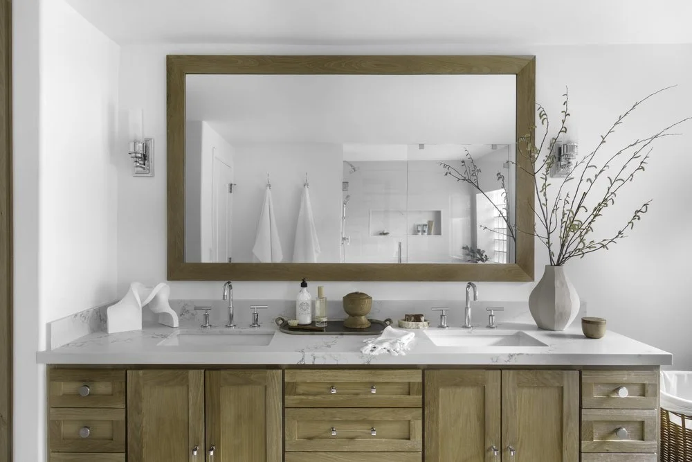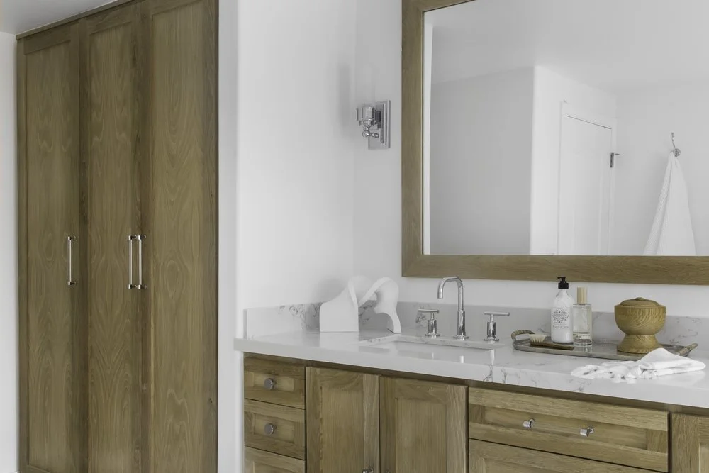 But perhaps the most impactful and beautiful upgrade to this bathroom is the custom white oak vanity and mirror we designed for the couple. With its quartz countertops and sleek, stunning fixtures, this new vanity is gorgeous and functional. We used the white oak for the doors of the linen closet as well since they are visible from the bedroom—so it was important to showcase them.